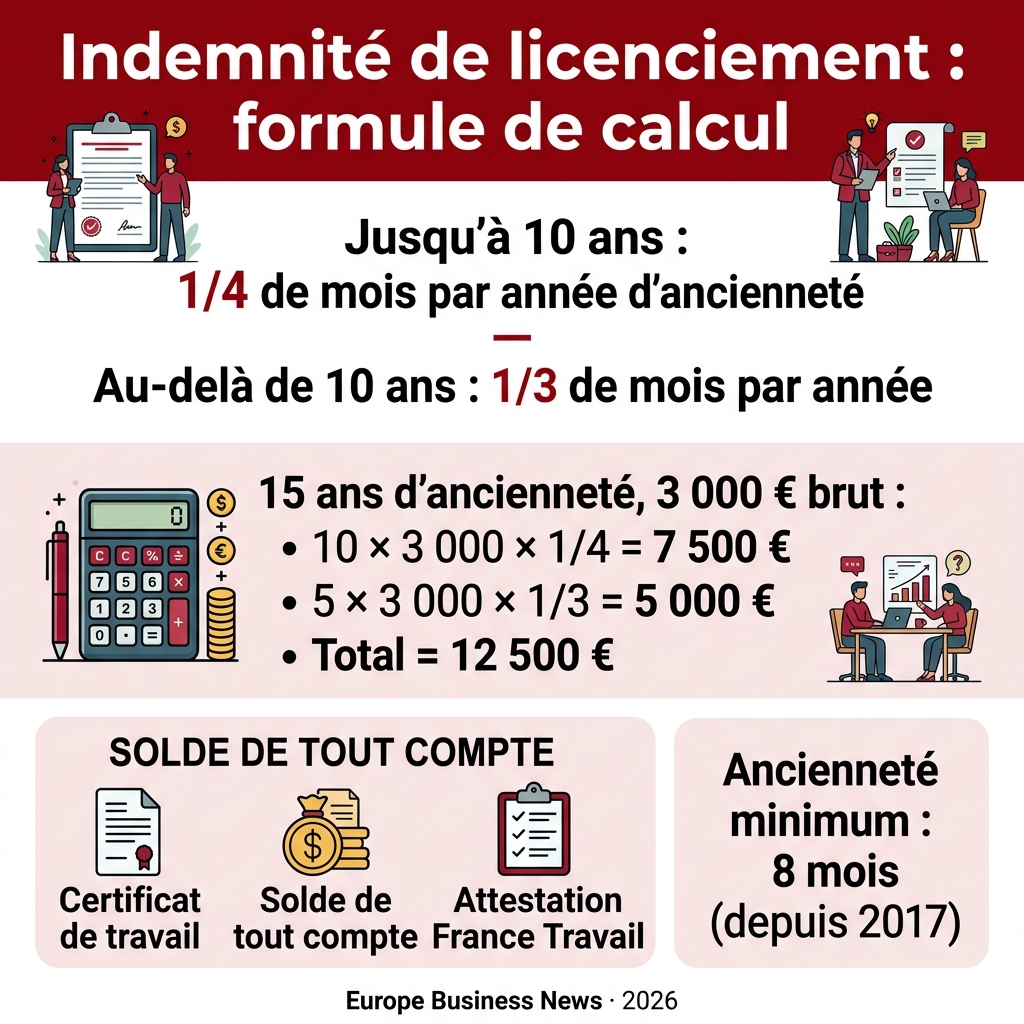 L’indemnite legale de licenciement est calculee selon la formule de l’article R.1234-2 : 1/4 de mois par annee d’anciennete jusqu’a 10 ans, puis 1/3 au-dela. Le salaire de reference est le plus favorable entre la moyenne des 12 ou des 3 derniers mois. L’indemnite est due des 8 mois d’anciennete (depuis 2017). Elle est exoneree d’impot et de cotisations sociales dans certaines limites. Le solde de tout compte regroupe toutes les sommes versees a la fin du contrat.
