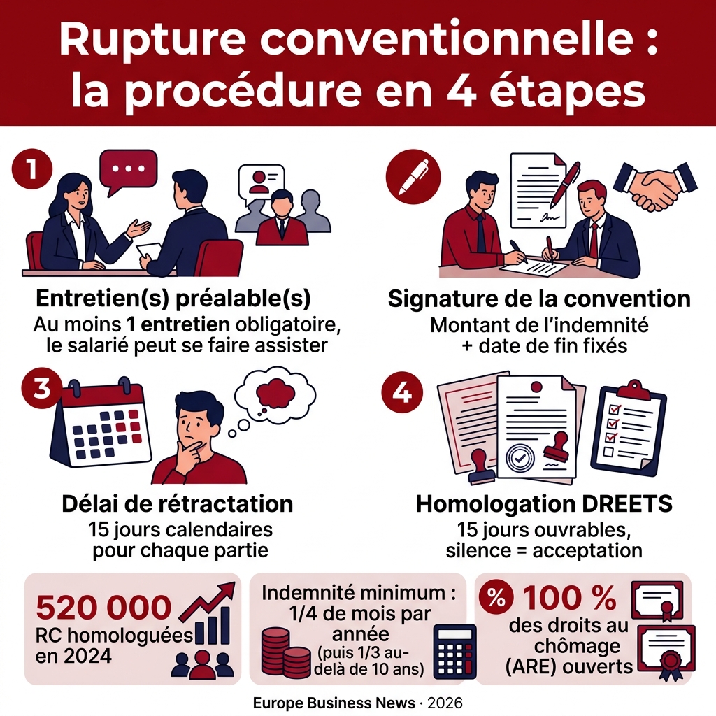 La rupture conventionnelle permet a un salarie en CDI et a son employeur de mettre fin au contrat d’un commun accord. Elle ouvre droit aux allocations chomage (ARE). L’indemnite ne peut pas etre inferieure a l’indemnite legale de licenciement (1/4 de mois par annee jusqu’a 10 ans, 1/3 au-dela). La procedure dure au minimum 30 jours (15 jours de retractation + 15 jours d’homologation). En 2024, plus de 520 000 ruptures conventionnelles ont ete homologuees en France.